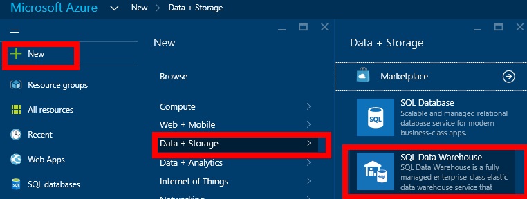 When you create your data warehouse you select the number of DWU’s to allocate (don’t worry you can change this after it is set up so the initial value is not very important), you select a database, location and resource group. One nice thing to help you get started is that you can actually load it with a sample dataware house based on the AdventureWorks database directly to start testing. It goes without saying that you can create an empty data warehouse from scratch also.