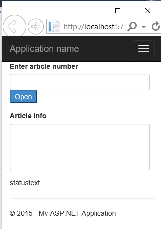<div class=”form-group”><label for=”txtArticleNumber”>Enter article number</label><asp:TextBox ID=”txtArticleNumber” CssClass=”form-control” runat=”server”></asp:TextBox>
