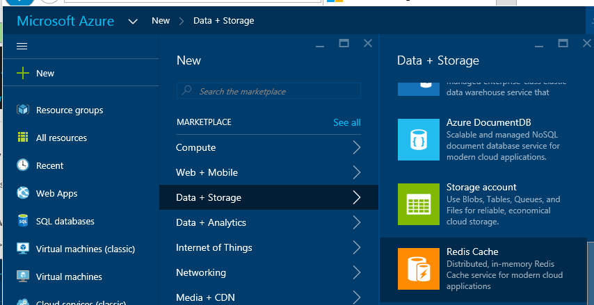 Enter the preview portal (even though you could just as well create this through Azure powershell also if you’re into that). Select Data+Storage and scroll down to Redis Cache.