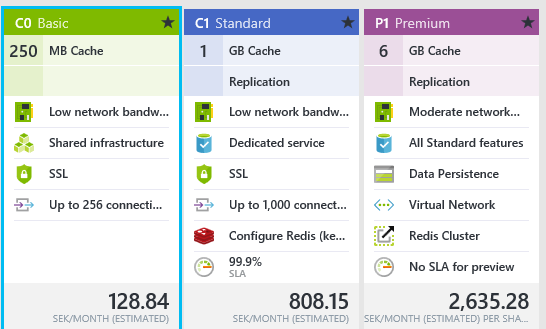 As you can see from above the smaller instances are actually not very expensive (USD and EUR cost is approximately 10% of SEK). Note that there are multiple sizes within each level with diferent costs and that for the Premium cache the price is per shard not per cache. Calculate your needs what will give you the best/price performance for your needs. Remember that scale-out is often more cost efficient than scale-up (selecting the biggest instances).