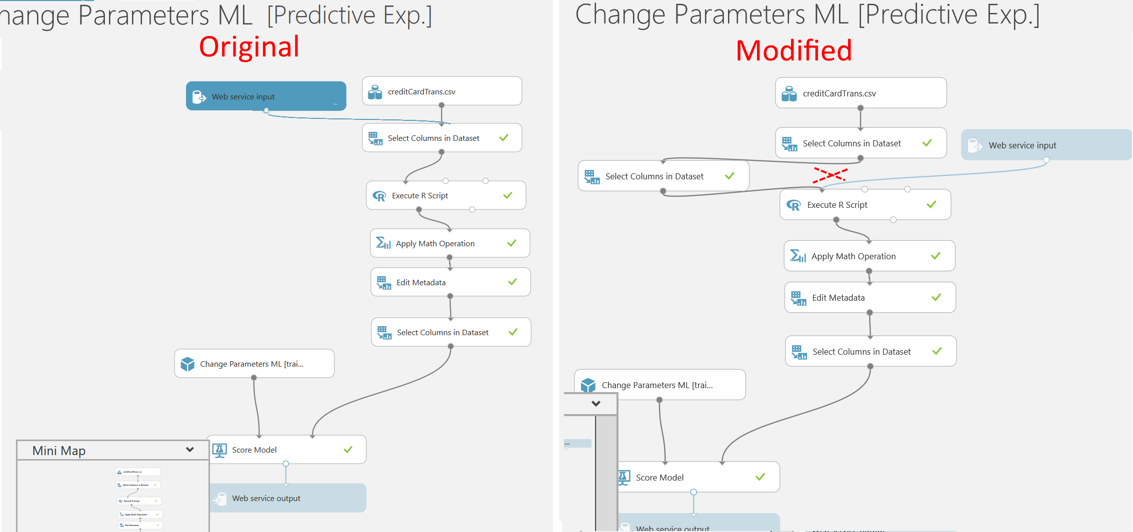 This will adjust the input of the web service. To test the correctness of the experiment you should run it. In my example I had to change some code in my R script later in the flow that handled the “IsFraudulent” column as I had now removed it in the new “Select columns in dataset”.