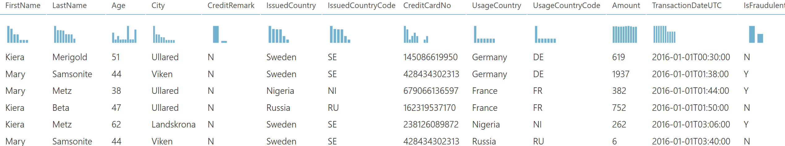 The trained model was based on the following columns in a CSV file which simulates a history of fraudulent and non fraudulent credit card transactions from people of various ages with credit cards issued in different countries and purchases being made in different countries and with different amounts. The end goal was to be able to predict the likelihood of a fraudulent transaction from, for example, Stream Analytics or an e-commerce site by calling the produced web services generated from ML (see previous post on how to do that).