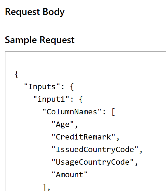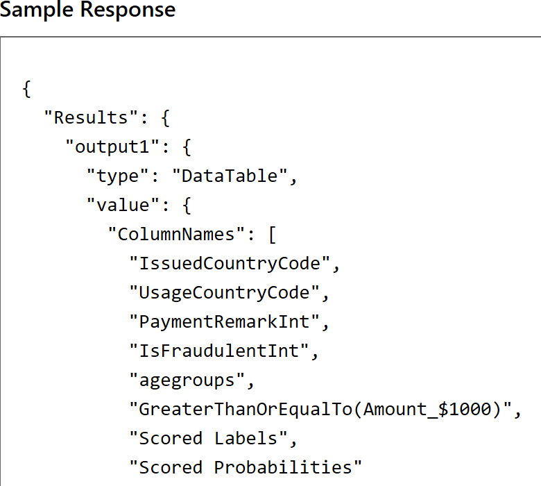 In my case I wanted to send in only the important fields to be able to predict the likelihood of fraud. That would correspond to the following parameters to the web service
