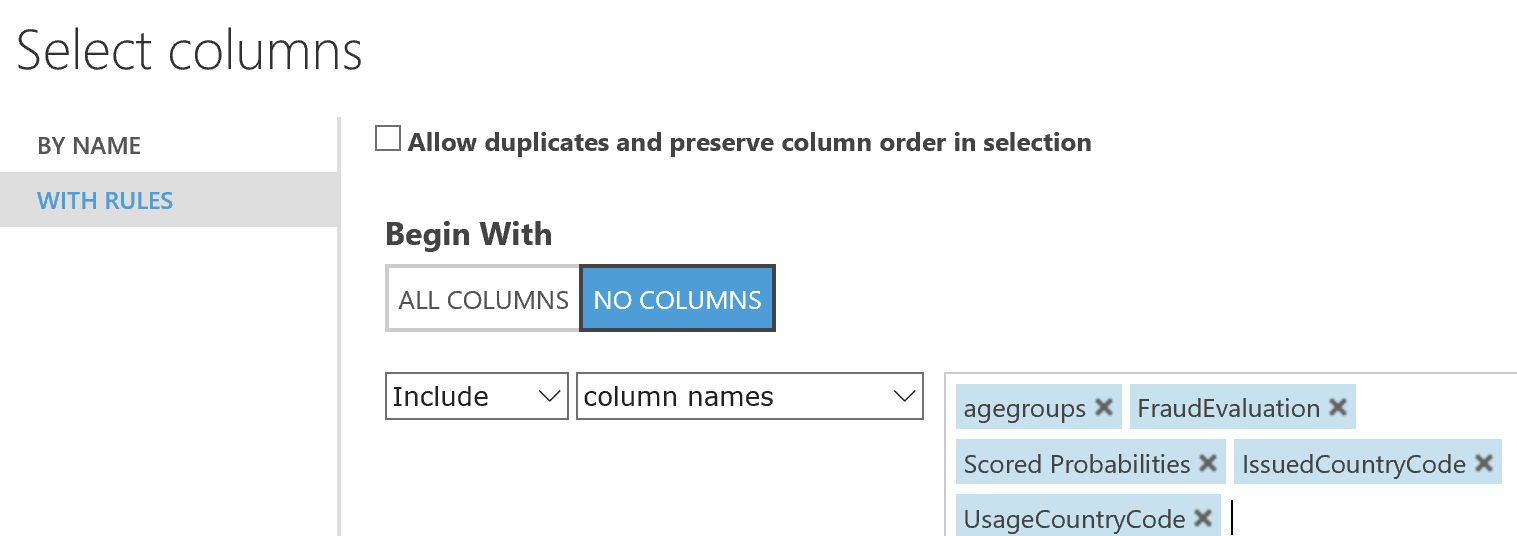 - In my scenario I wanted to return the bool value whether the experiment indicated possible fraud, the calculated probability and what age category the person was classified as. I don’t need all the parameters that I used to call the web service anymore so they can be removed. So I added a “Select columns in dataset” task in the end and selected only the desired columns.