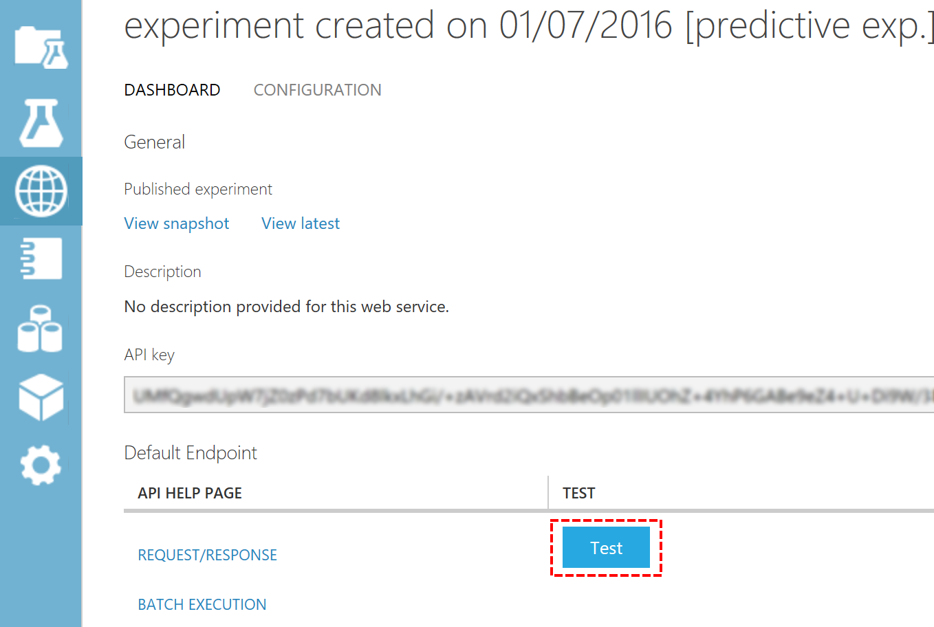So now that I am satisfied with my experiment I want to create a Web service from this experiment by clicking “Set up web service”-“Predictive Web Service”.