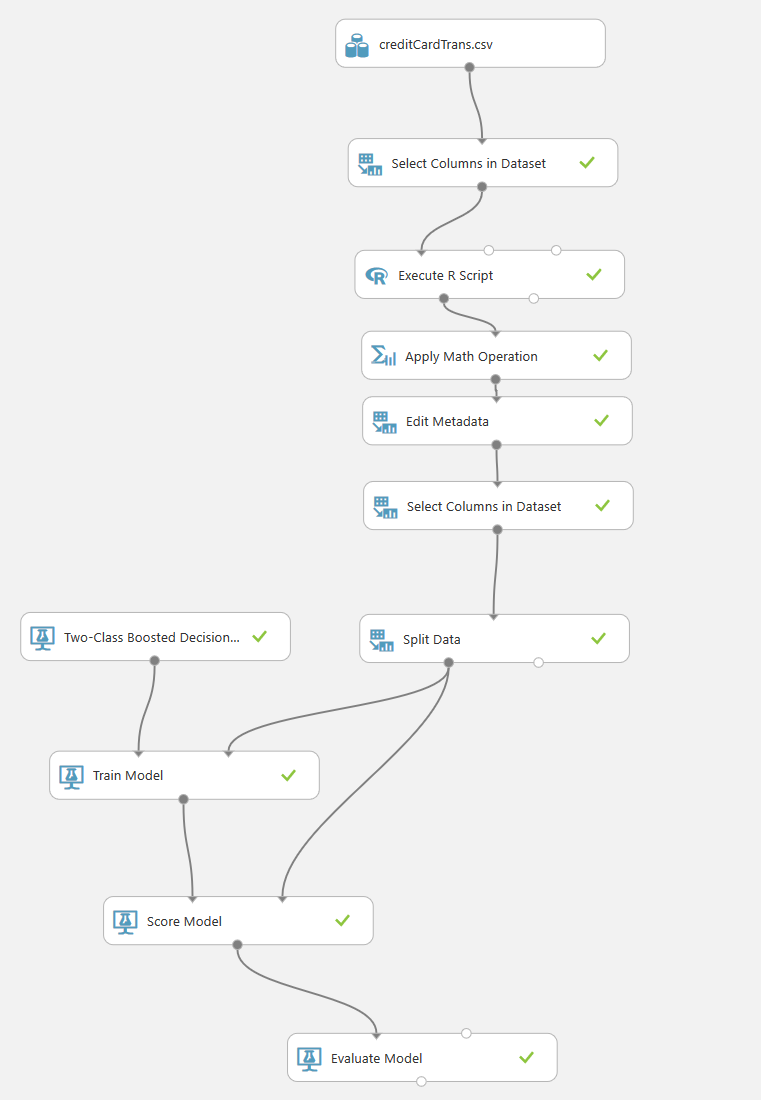 - In my case you remember that I wanted to return some label based on the result like “Likely Fraud” and “Unlikely Fraud” instead of just 0 and 1. To do this I add a R script after the evaluation. I create a new column based on “Scored Labels” and then I remove the “Scored Labels” column.