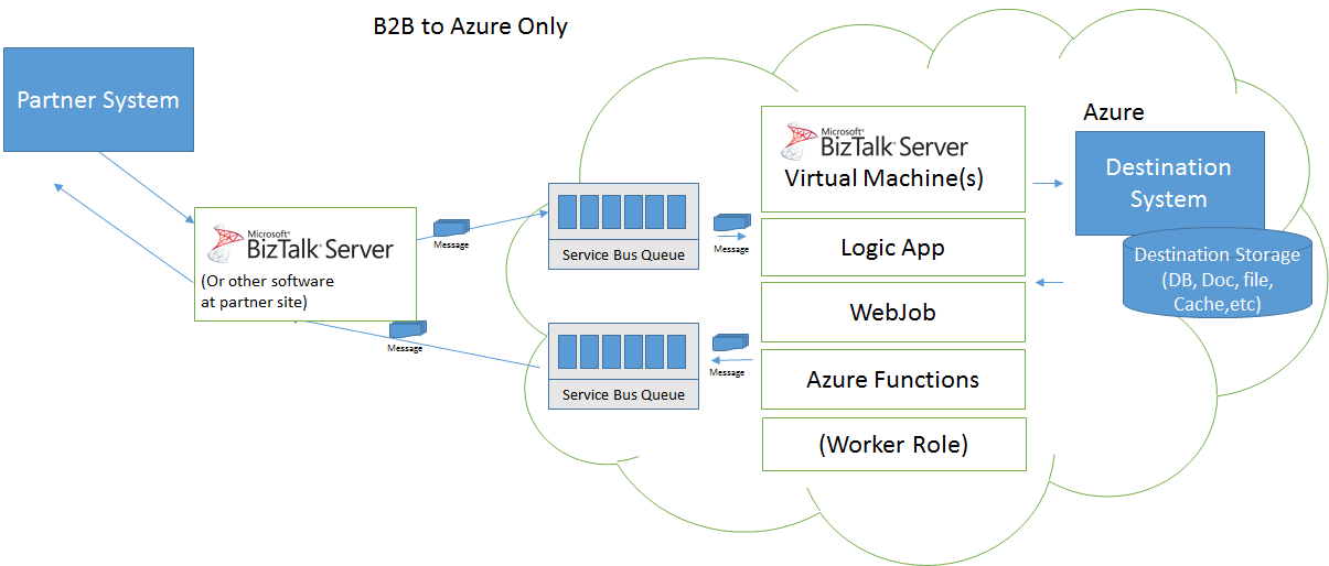 As far as asynchronous messaging you would likely use Azure Service bus to post/receive messages from/to your partners through queues/topics. In many cases you don’t have an integration plattform in Azure yet which may be fine if you have few integrations to few systems. You will in such case probably utilize Logic Apps, Worker Roles or WebJobs to post and process messages in the queues. I would not rule out setting upp VMs in Azure with a BizTalk (or similar) once the number of cloud deployments and integrations increase in the cloud. Having hundreds of logic apps/Workers/WebJobs to monitor will likely not be the most efficient scenario and can easilly grow out to a unmaintainable spidernet of point-to-point integrations (see my reasoning about point-to-point earlier).