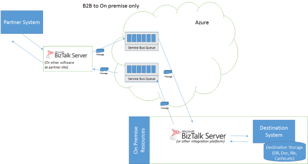 This is the likely scenario of a company not having come so far with their cloud transformation. This could have many reasons that I have seen – like heavy investments in own data center, -fear of storage of personal data, -contractual issues or other reasons. Usage of the service bus for temporary storage of messages in a B2B scenario or allowing the partner to call on premise services (without port openings) could be very usefull for your solution. It provides a secure gateway that is accessible by both parties – compared to set up DMZ servers (with for example FTP) on your network with all the firewalls, tunneling, routing that is needed to get it working)