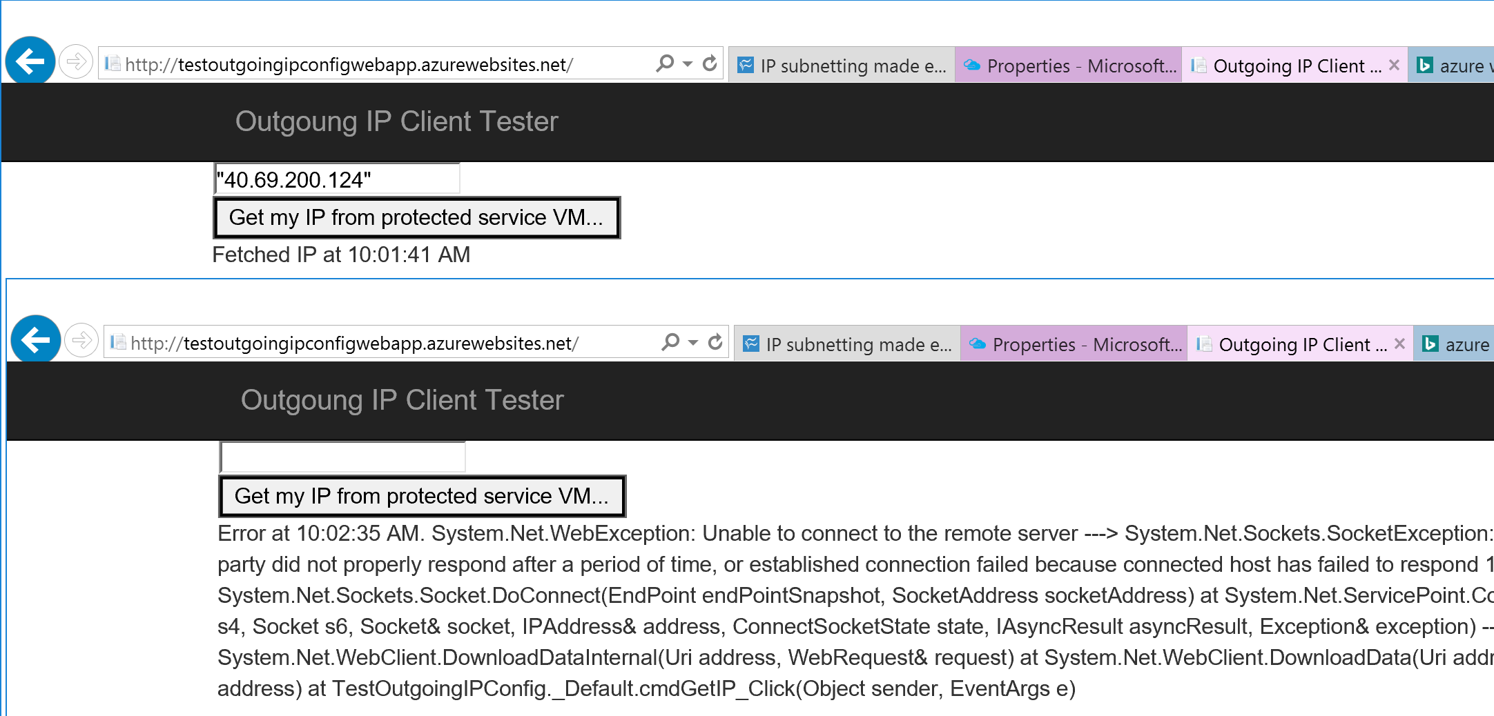 I have received some comments about a previous post where I discussed the scenario of an Azure web app that needs to call a protected web service. The protected web service needs to be configured to allow access (for example via its firewall) to the outbound IP address of the Web App. You can read the whole previous post here. A few readers have had problems with this and claims that not only do they need to enter the outgoing IP of the web app (for example 13.74.185.187) but also a x.x.x.0 address (in the above example 13.74.185.0) which I had never heard about before. While I have been extremely busy lately I was very interested in these findings and wanted to try it myself and now that time has come.
