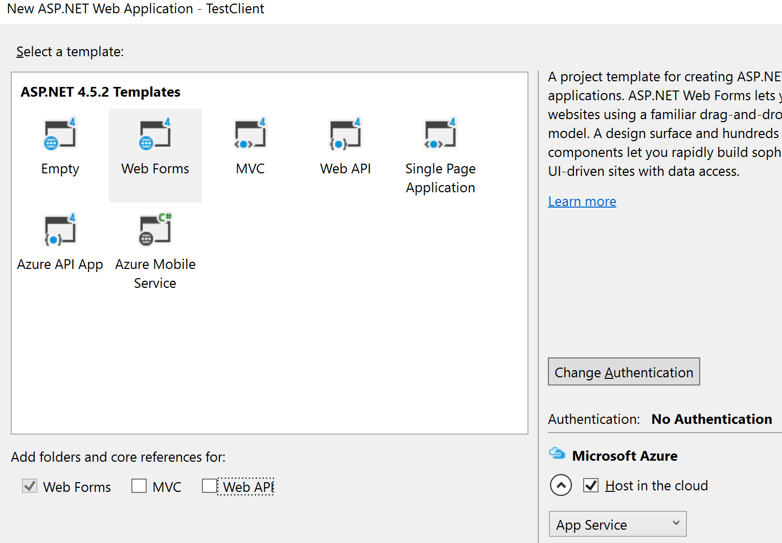 I start by creating a Web App with the cloud template for Web Application with Web Forms, no authentication.