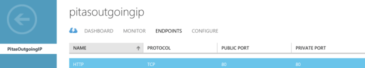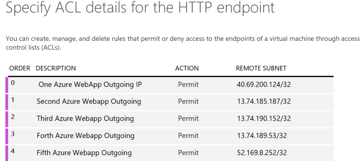 I will now set up some ACL rules (Access Control Lists) for preventing access from all but the allowed IP addresses from the portal to access the services. I was a bit lazy when I set up the servers and used the legacy VM model (classical) because it is very easy to set up ACL in the old portal (and saved me some time). Normally you would create the modern version of VMs. Anyway, in the old portal, I browsed to my VM, selected the HTTP endpoint and pressed the “Manage ACL” button.