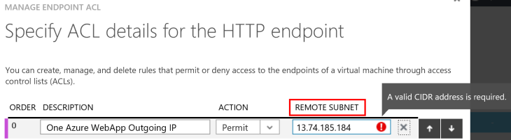 You can use a tool for determining the subnet, for example https://mxtoolbox.com/SubnetCalculator.aspx. Make sure you select only one IP Address in the dropdown. If you are unfamiliar with subnets, you will quickly learn that /32 subnet will always be the subnet for a single IP address so you can basically use /32 for all the outbound IP addresses from the web app in the ACL setup. This will make sure that you only open for individual IP addresses. I like the tool however, and it could be useful if you want to open for a range of IPs on the same network (think hybrid solutions). As an example /29 will give you 8 addresses (from 13.74.185.184 – 13.74.185.191).