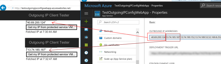 Above you can see two different results to the left (likely from the two instances). If you re-run the test you may end up on the same instance or the other one (I used two instances). This indicates that the IP address that the Client Tester Web App identifies its instances with uses the ones from the outbound ip addresses from the portal and that ARR Affinity works as intended. So far so good.